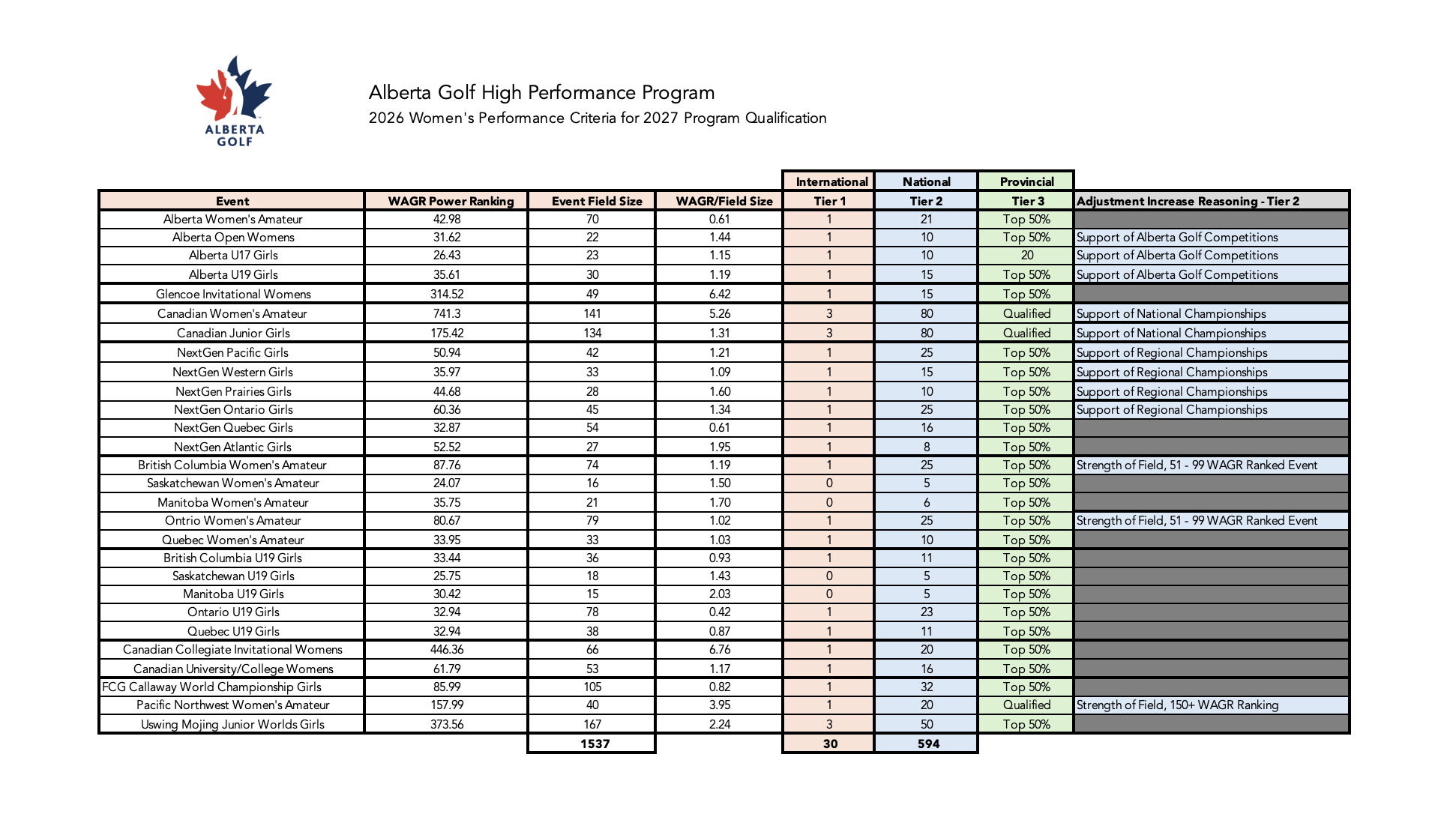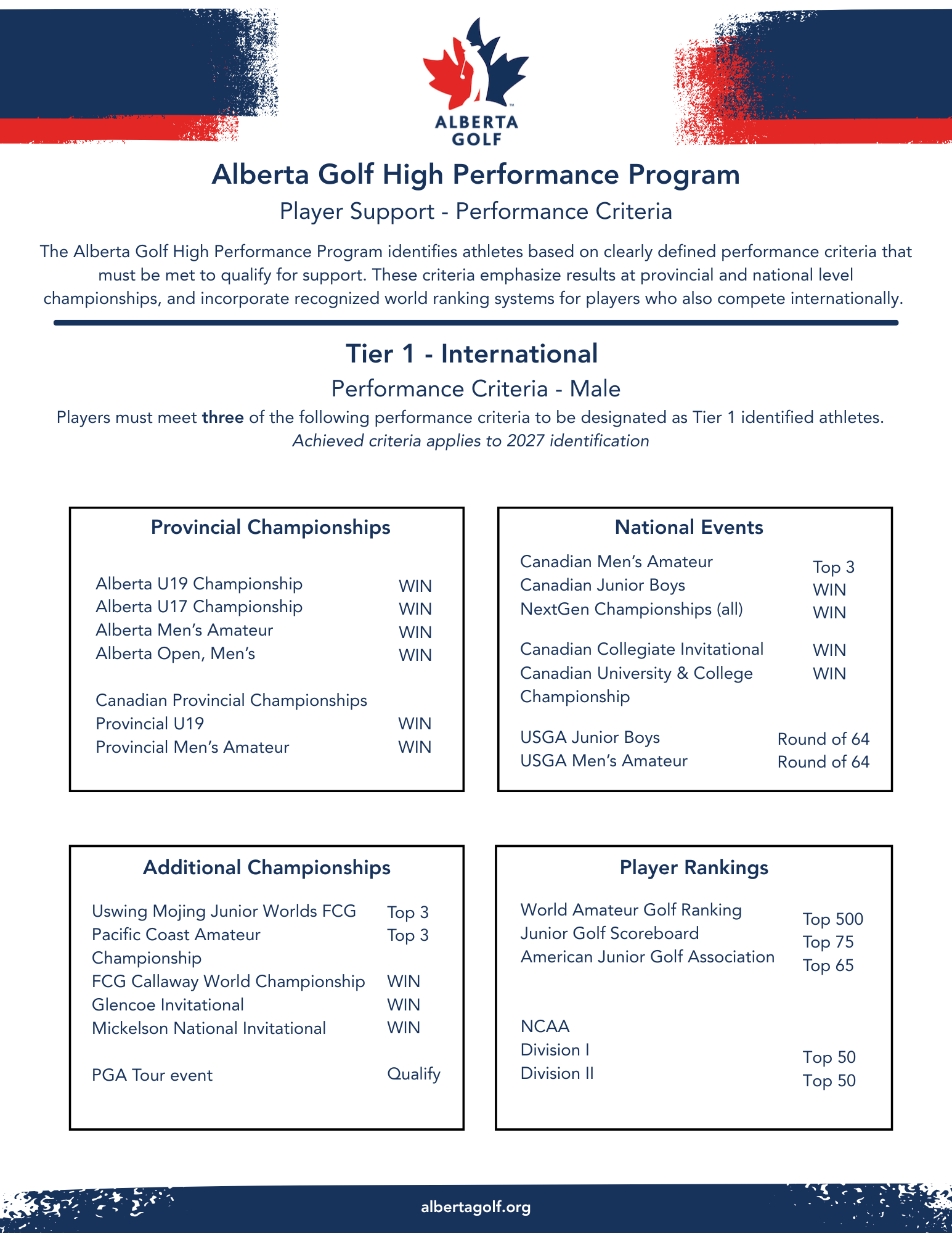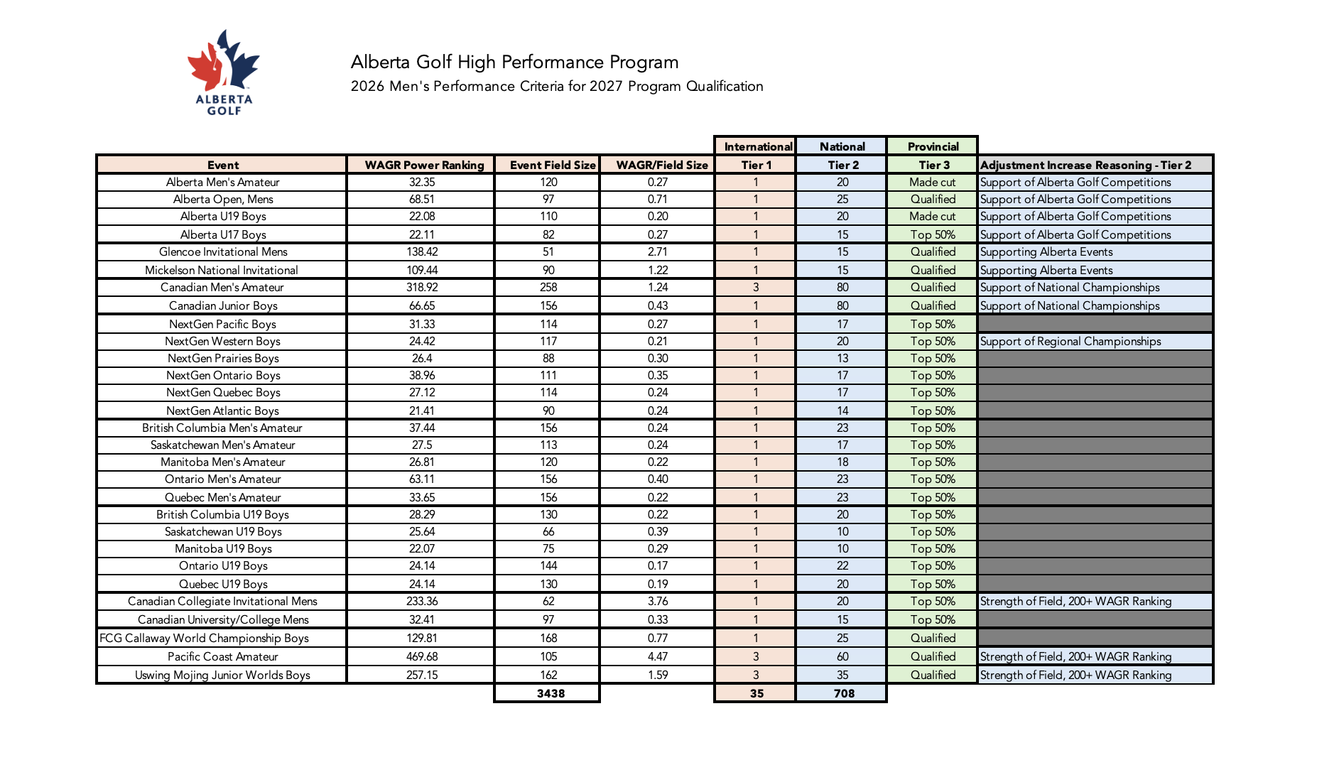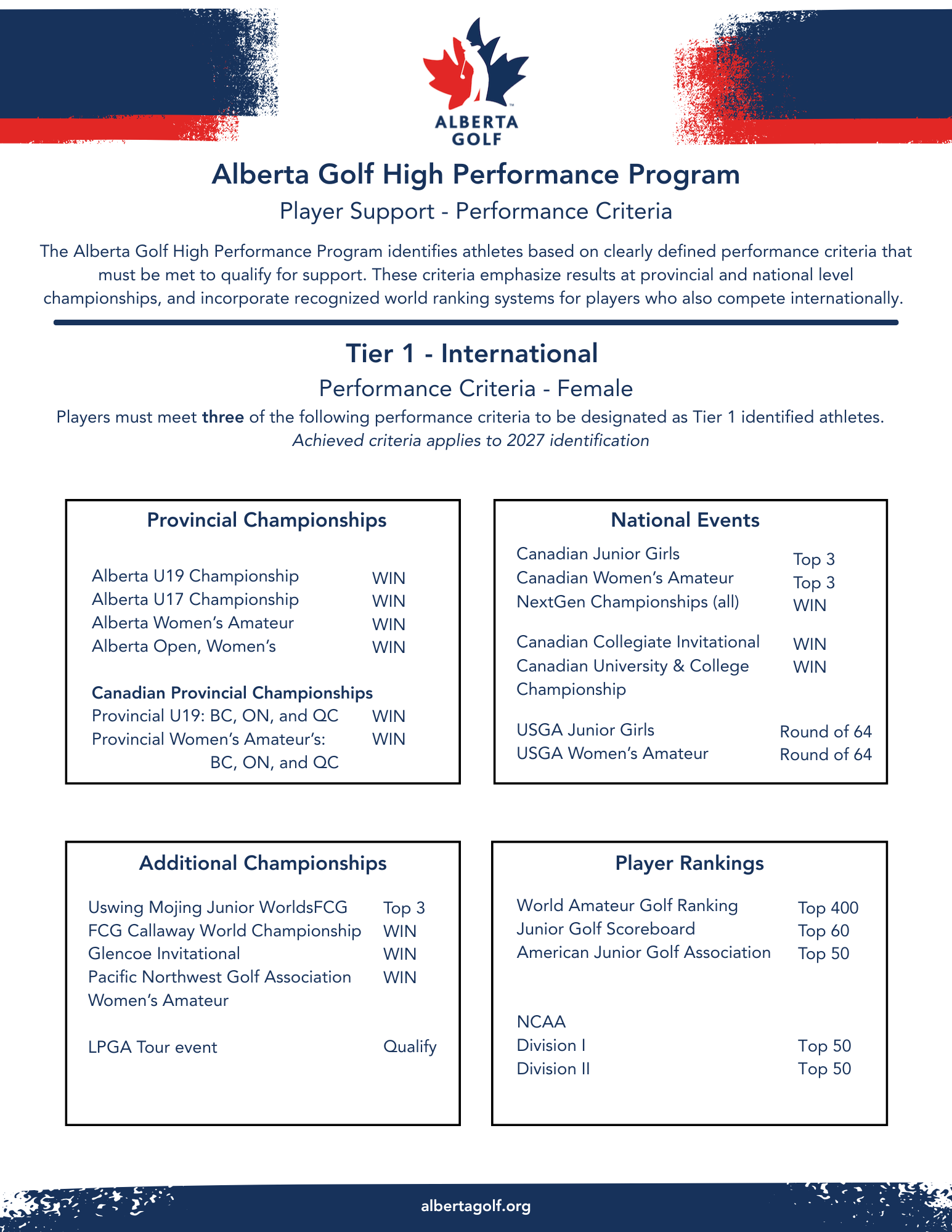 The performance criteria established for each tier are meticulously selected based on a range of predetermined requirements. These criteria ensure alignment with the Alberta Golf Competitive Roadmap and incorporate identified and ranked WAGR (World Amateur Golf Ranking) and JGS (Junior Golf Scoreboard) events. The focus is on providing athletes with opportunities at the local, provincial, national, and international levels, with an emphasis on Alberta Golf and Alberta-based competitions, alongside regional and national Golf Canada championships.