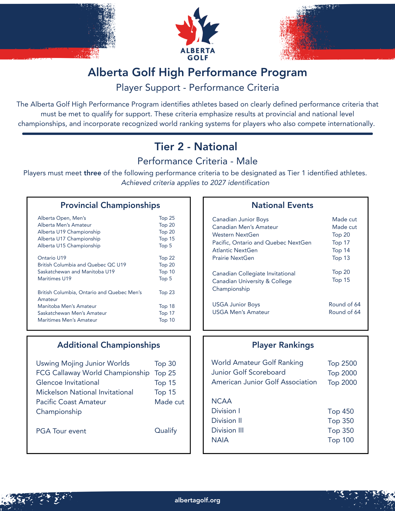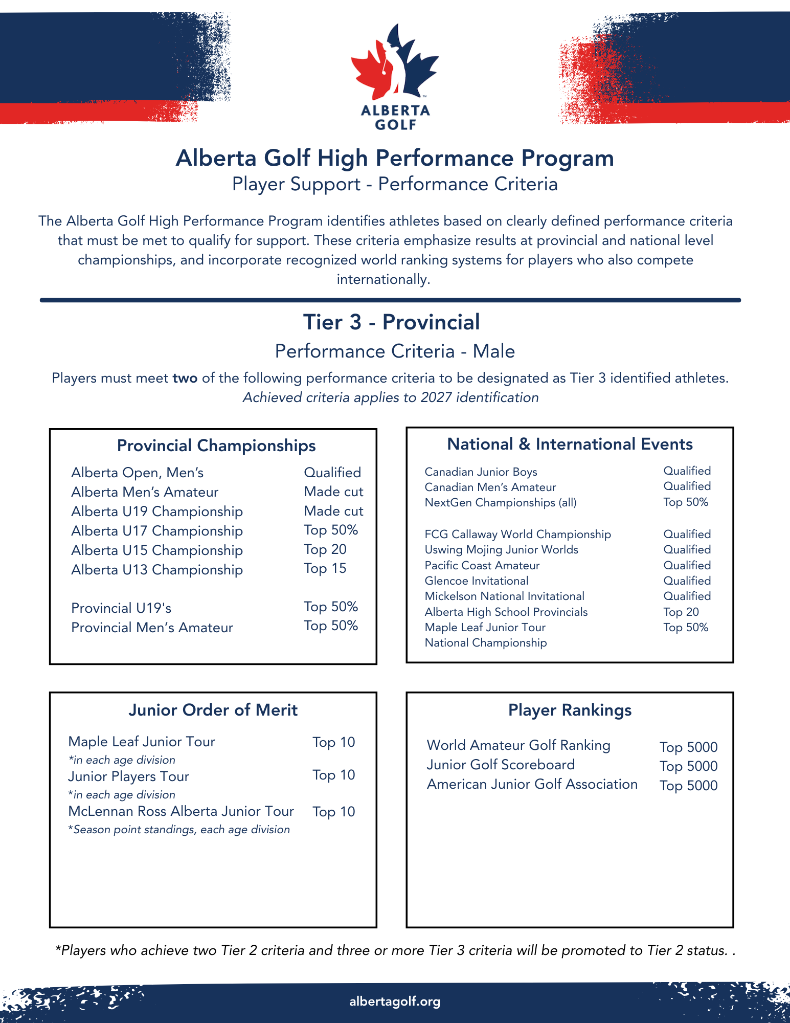 To ensure alignment with the program’s objectives, Tier 3 is now a U19 category which is split into 4 age identified categories: U19, U17, U15, & U13. These players are in the key development stages, and this age eligibility adjustment ensures the appropriate resources are applied to Alberta junior golfers.