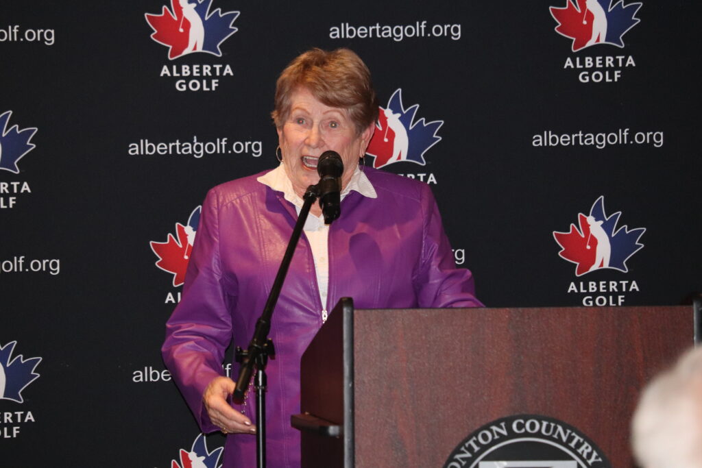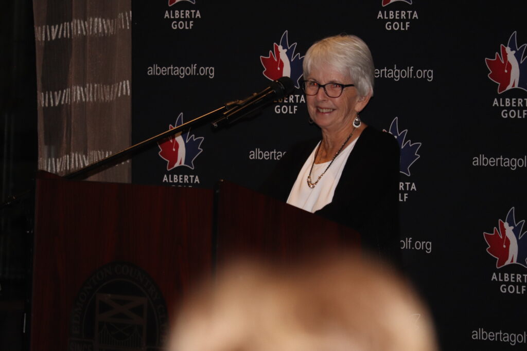 After dinner, the evening’s main event began — the official inductions of Jackie Little and Cathy McMillan into the Alberta Golf Hall of Fame.